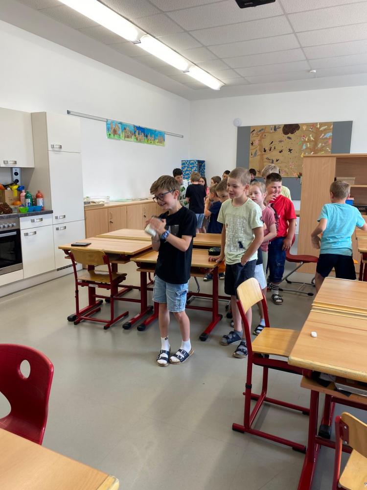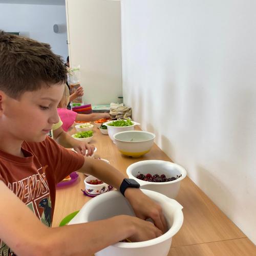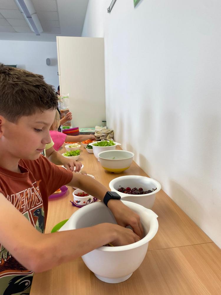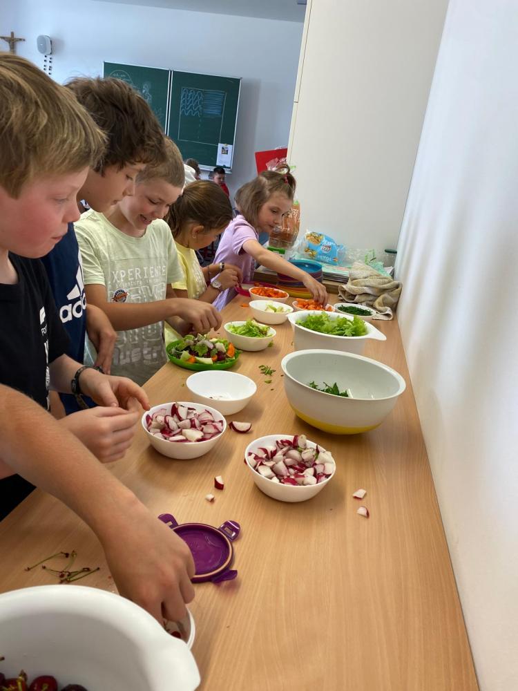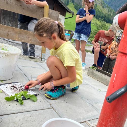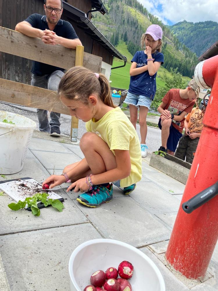 Geduldig wird das geernete Gemüse vom Schulgarten und von Garten unserer Lehrerin Laura Ortner gewaschen und in die passende Größe geschnitten.