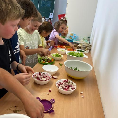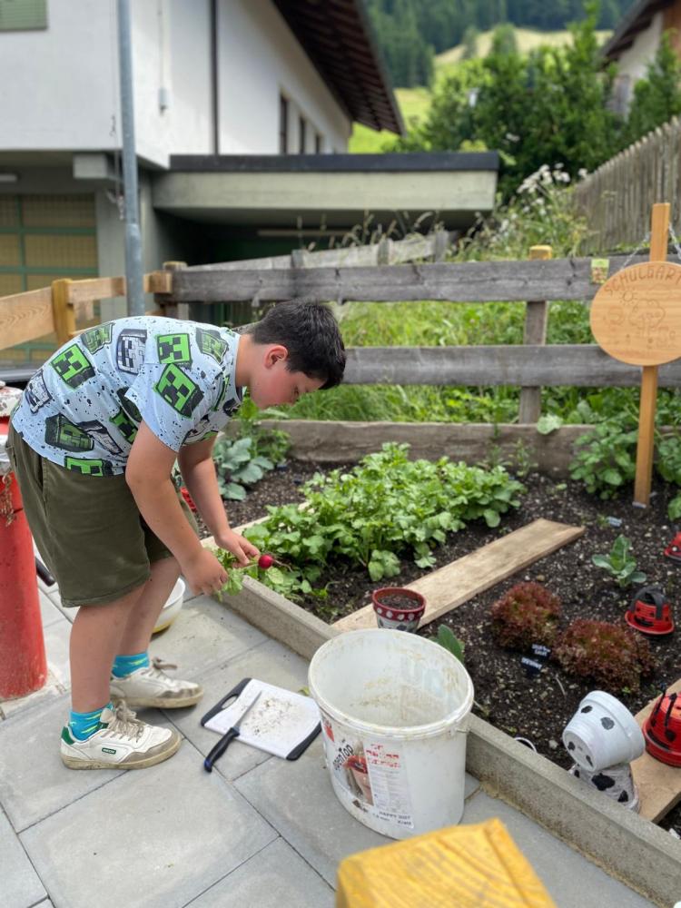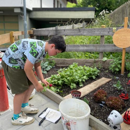 Salat, Radieschen und Kresse ernten wir in unserem eigenen Schulgarten.