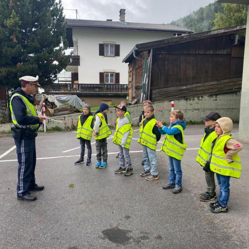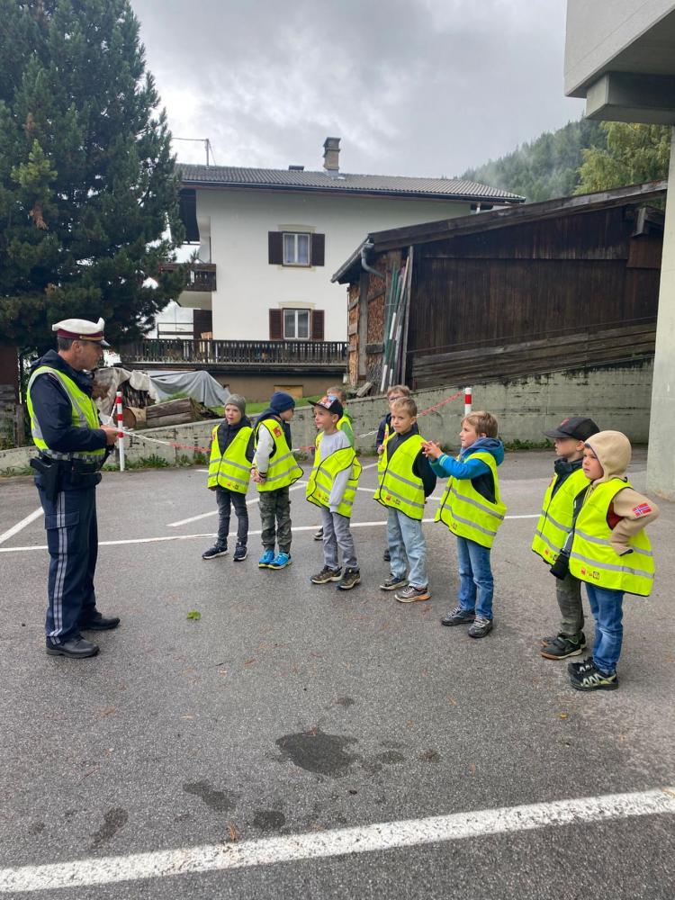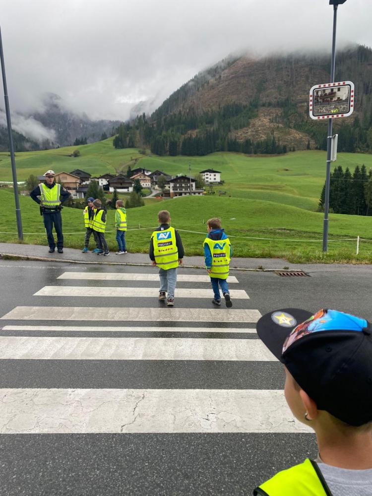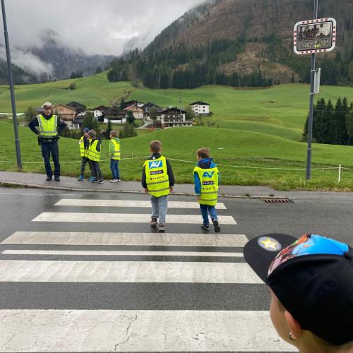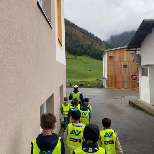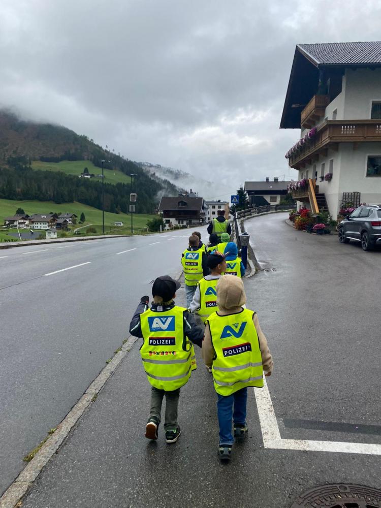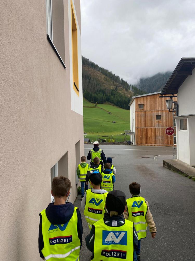 Gut ausgerüstet mit den Sicherheitswesten starten die Schüler vor dem Schulhaus.
