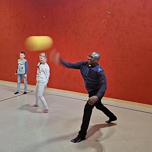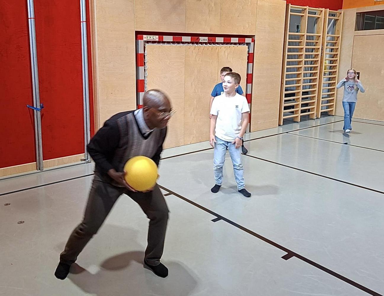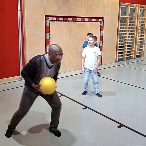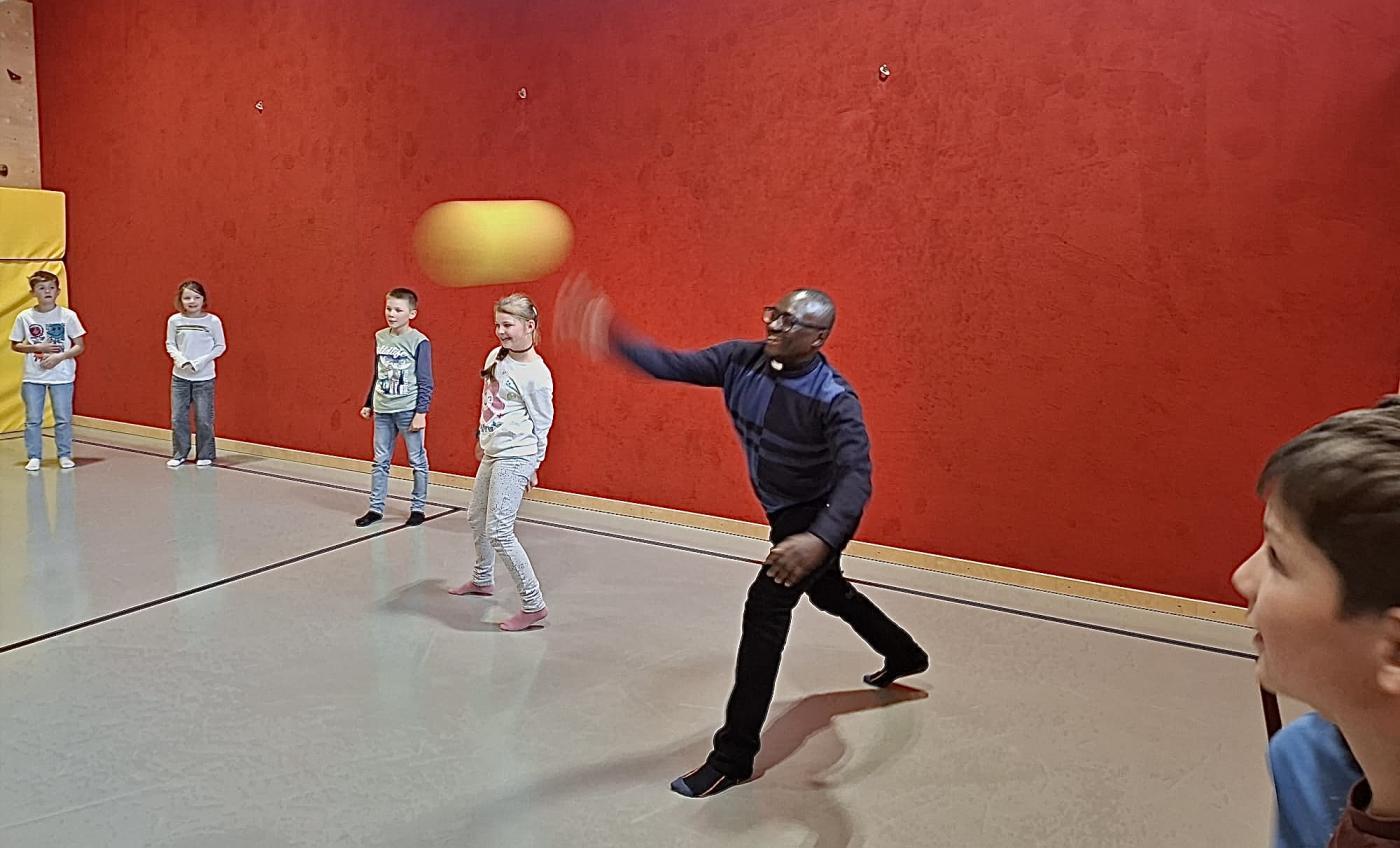 Der letzte Wunsch der Kinder aus der 3. und 4. Stufe wurde schließlich auch noch in die Tat umgesetzt: Pfarrer Vincent und Pfarrer Hèritier beteiligten sich an einem Ballspiel im Turnsaal.