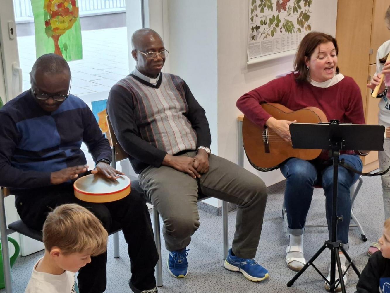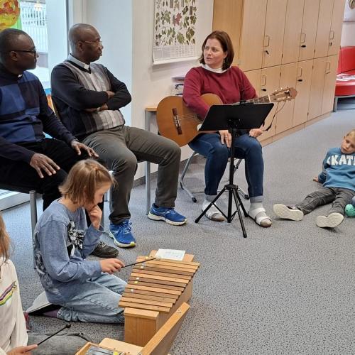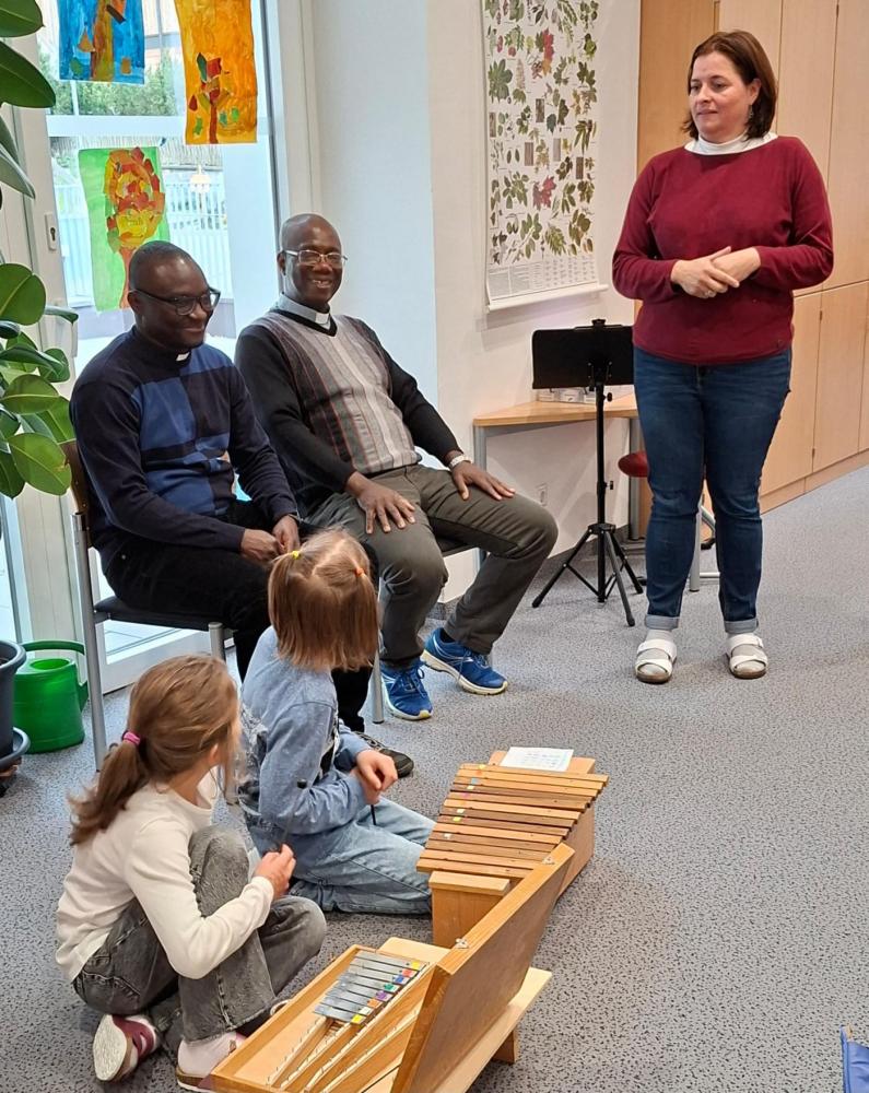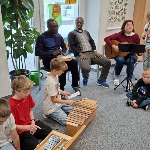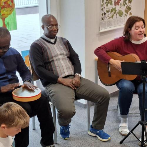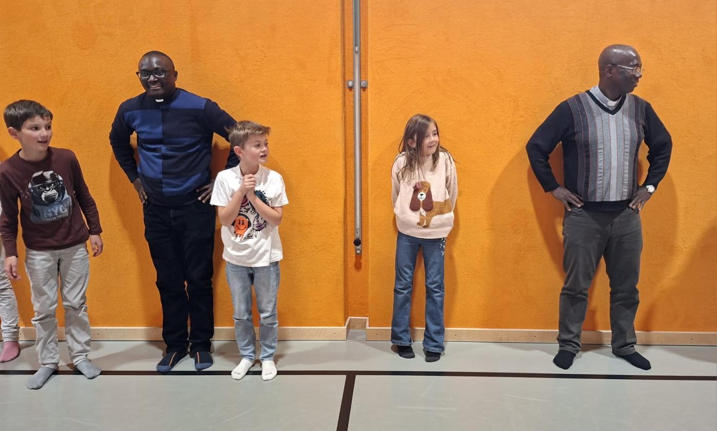 Bei unserem Schlusslied wurden wir von Pfarrer Hèritier auf der Trommel 🪘 recht musikalisch und rhythmisch unterstützt. Ein Platz in unserem Schulorchester ist ihm jederzeit sicher. 😉