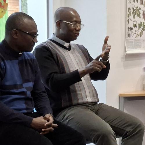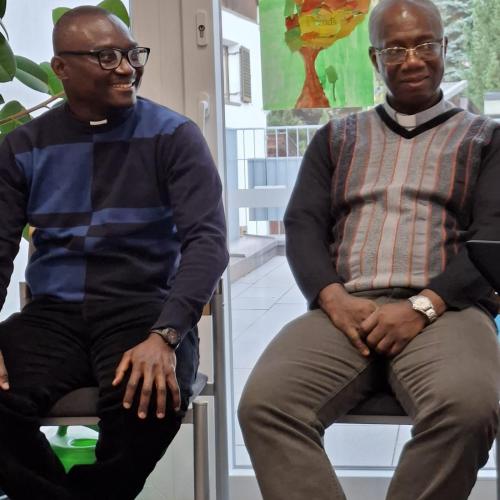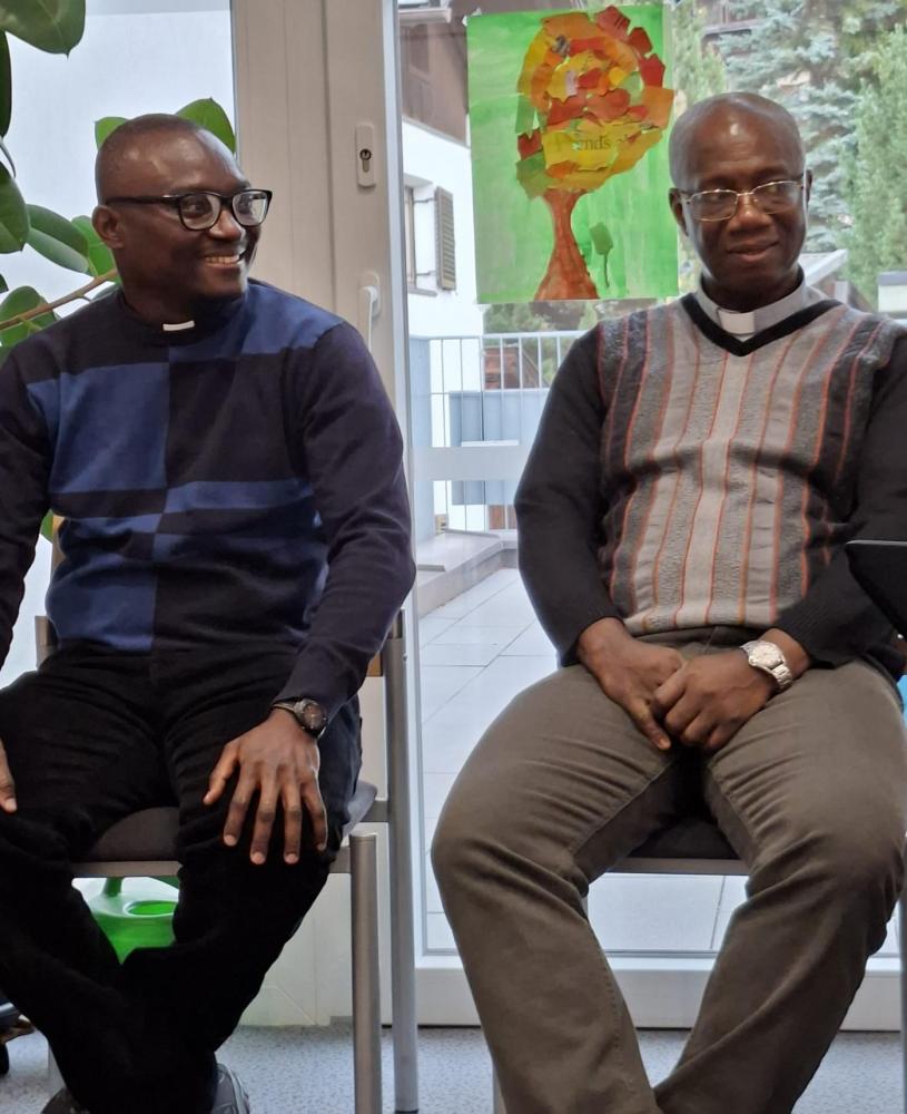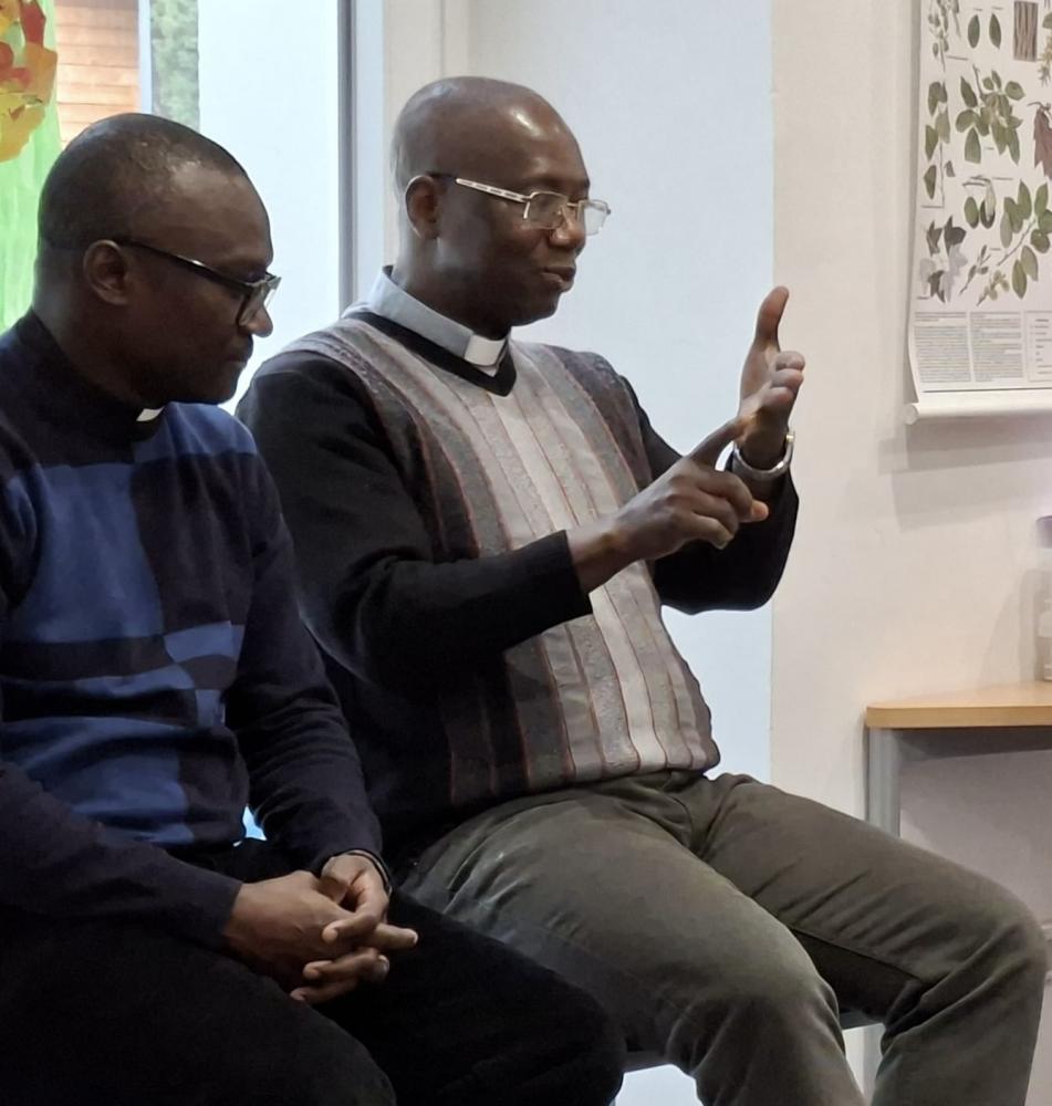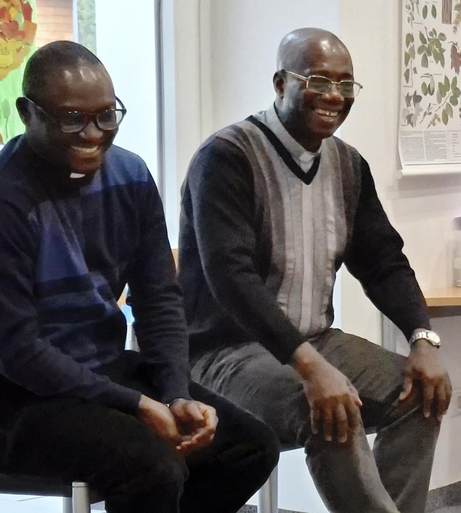 Und dann stellte sich Pfarrer Hèritier vor und beantwortete geduldig alle Fragen der Kinder. Auch Pfarrer Vincent durfte Fragen zum Kollarhemd, dem typischen "Pfarrerhemdkragen", und zum Zölibat beantworten.