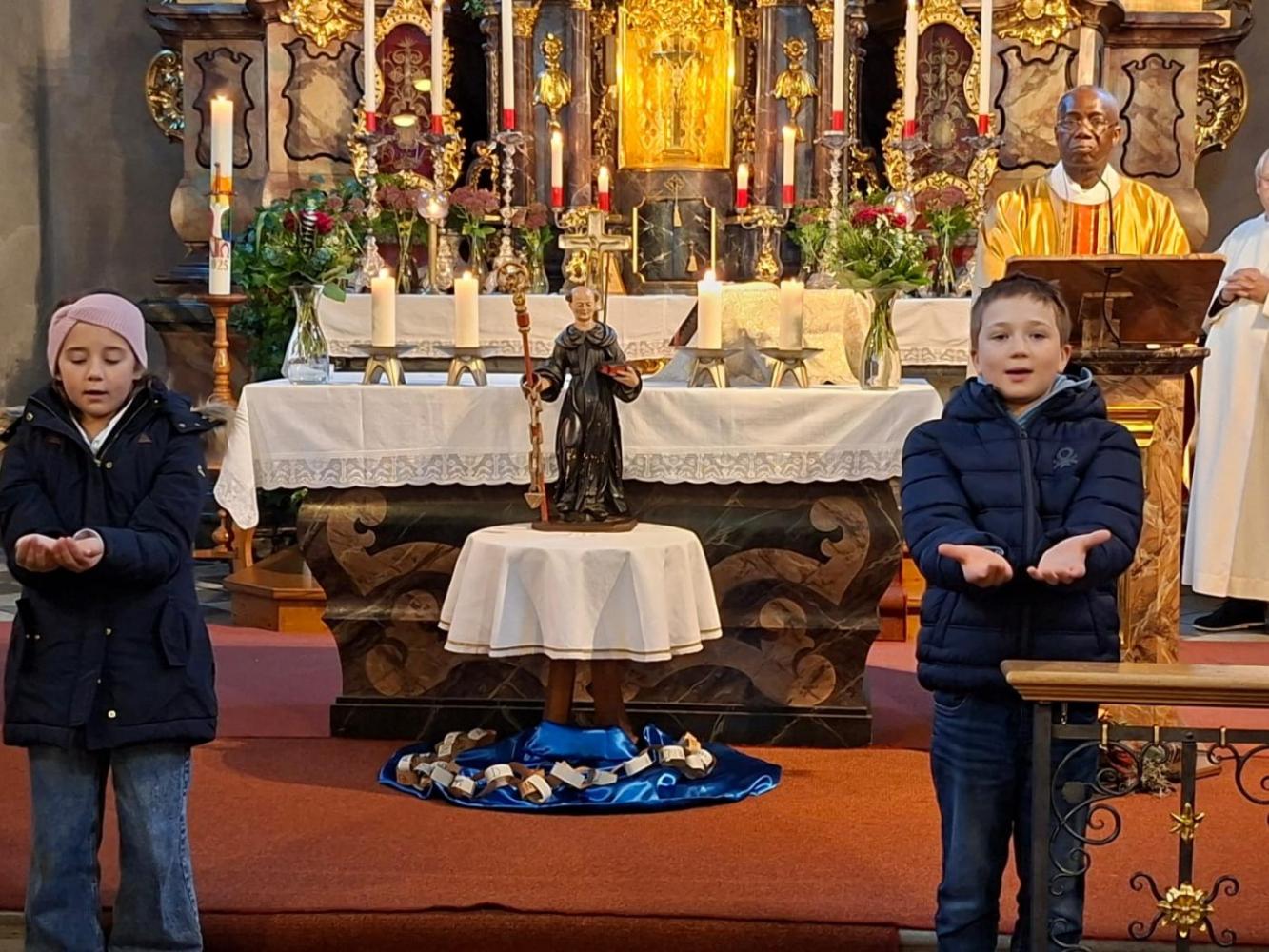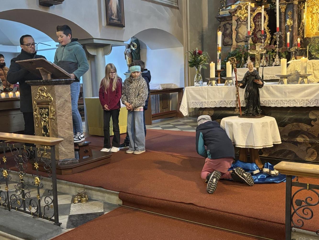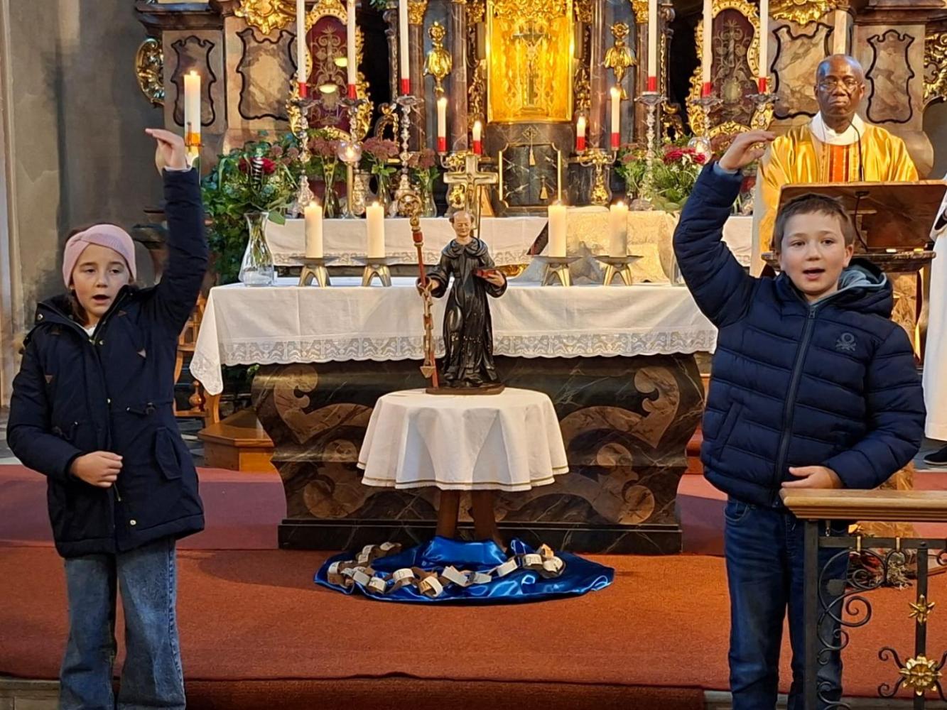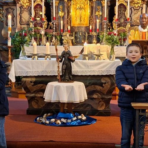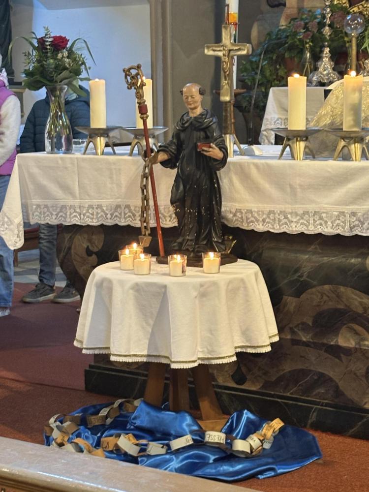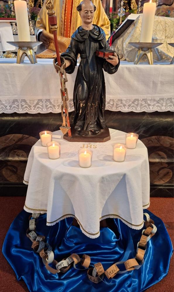 Nach der Begrüßung unseres Herrn Pfarrers stellen unsere Schüler:innen in der Einleitung Sankt Leonhard als Patron der Gefangenen vor. Eine Papierkette wird am Fuß der Leohardsstatue herumgelegt.