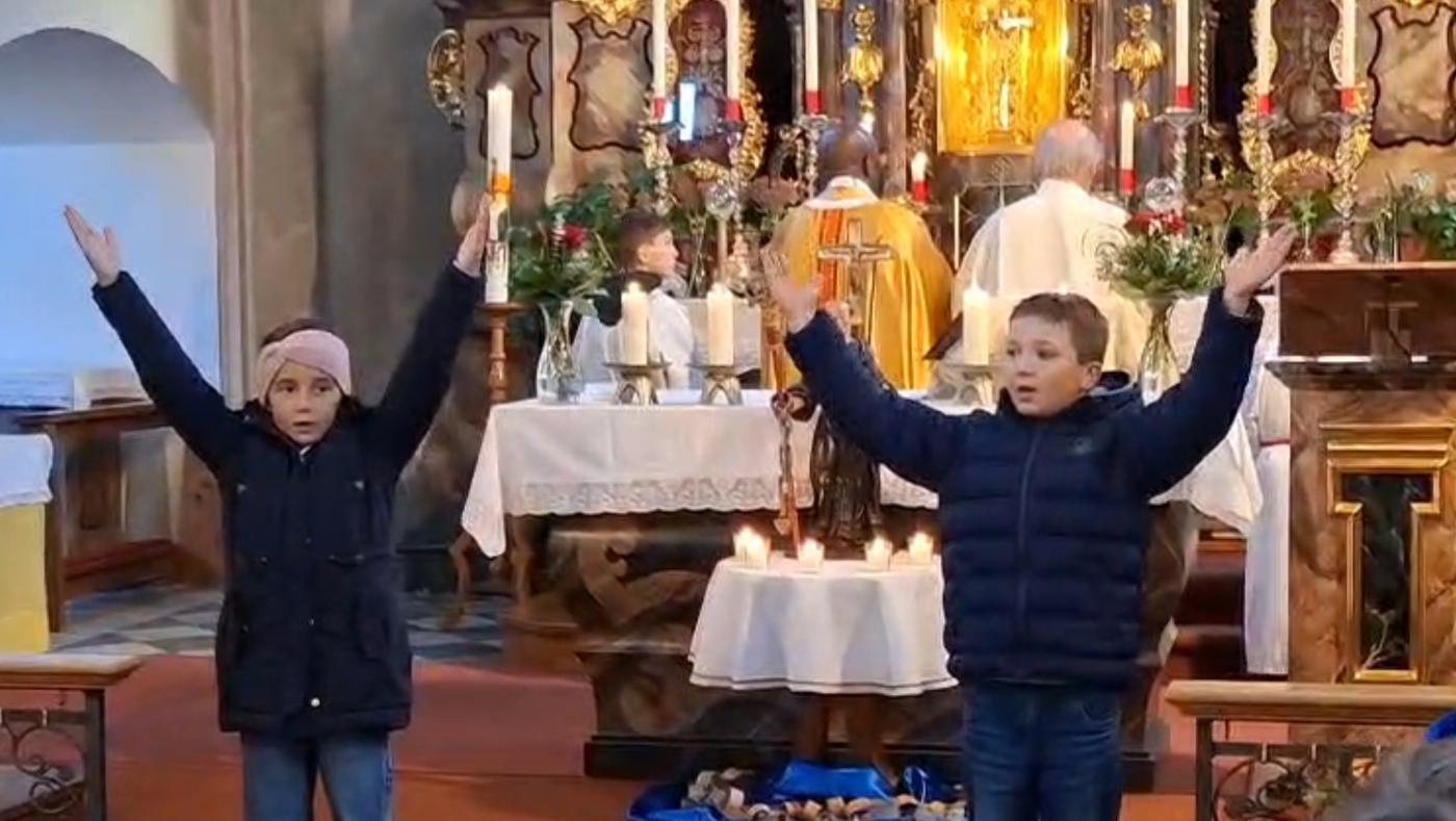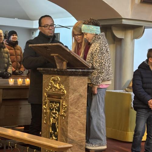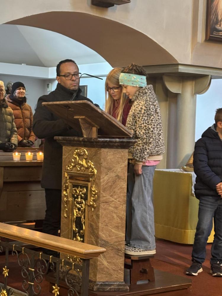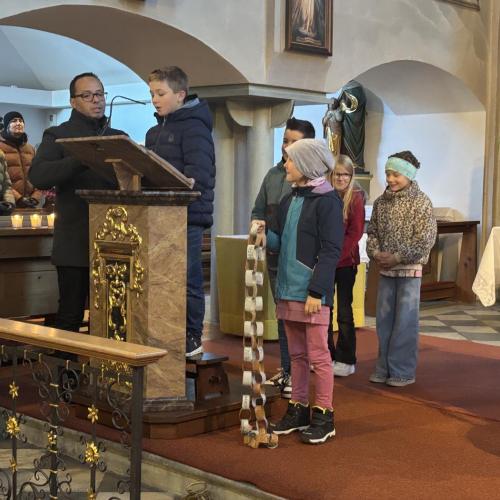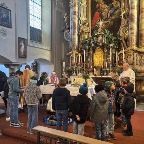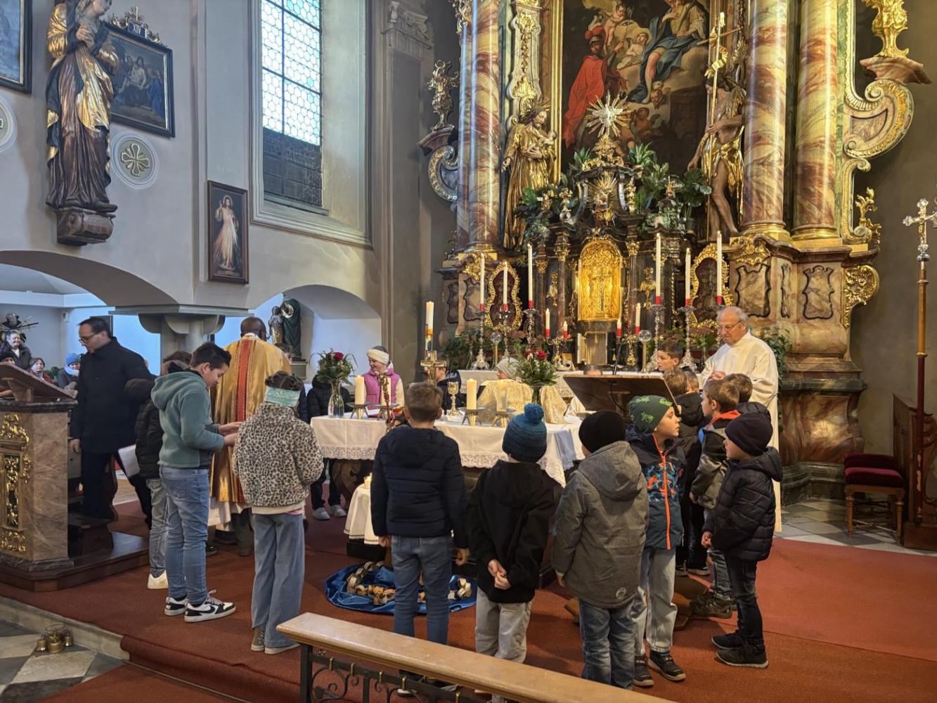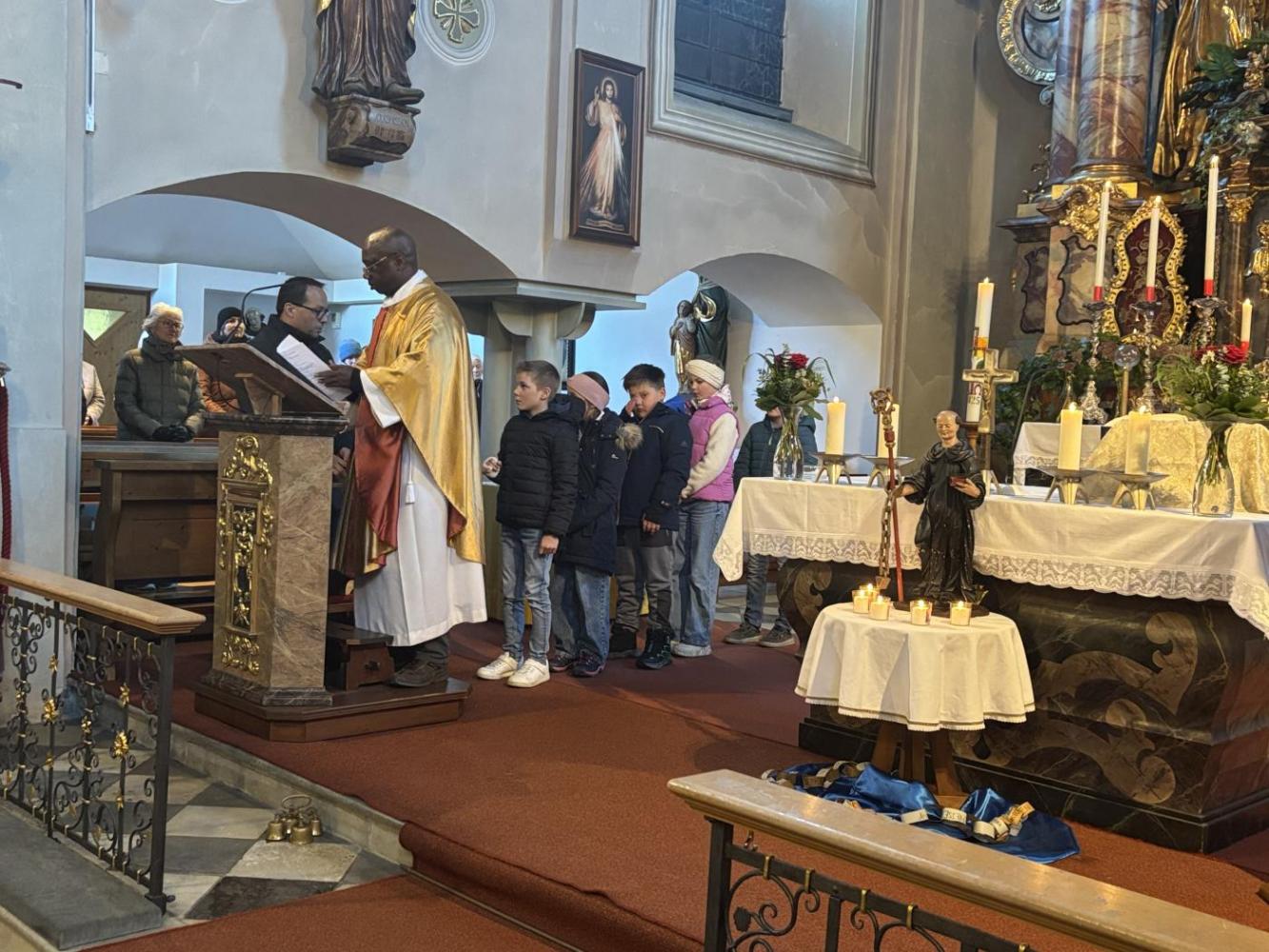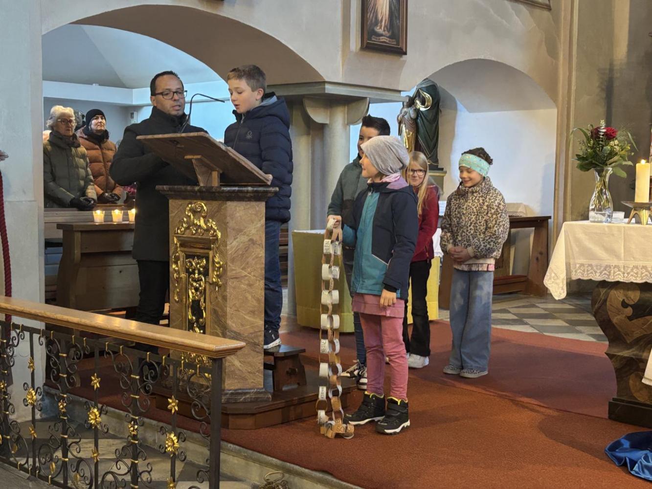 Nach der Begrüßung unseres Herrn Pfarrers stellen unsere Schüler:innen in der Einleitung Sankt Leonhard als Patron der Gefangenen vor. Eine Papierkette wird am Fuß der Leohardsstatue herumgelegt.