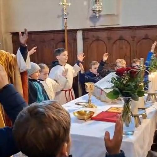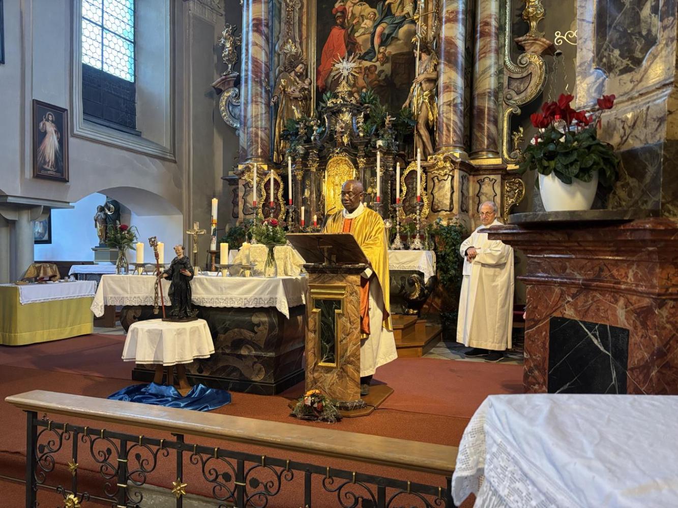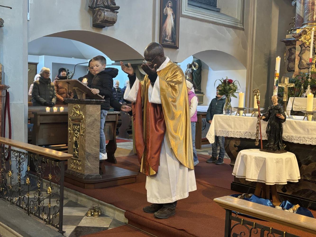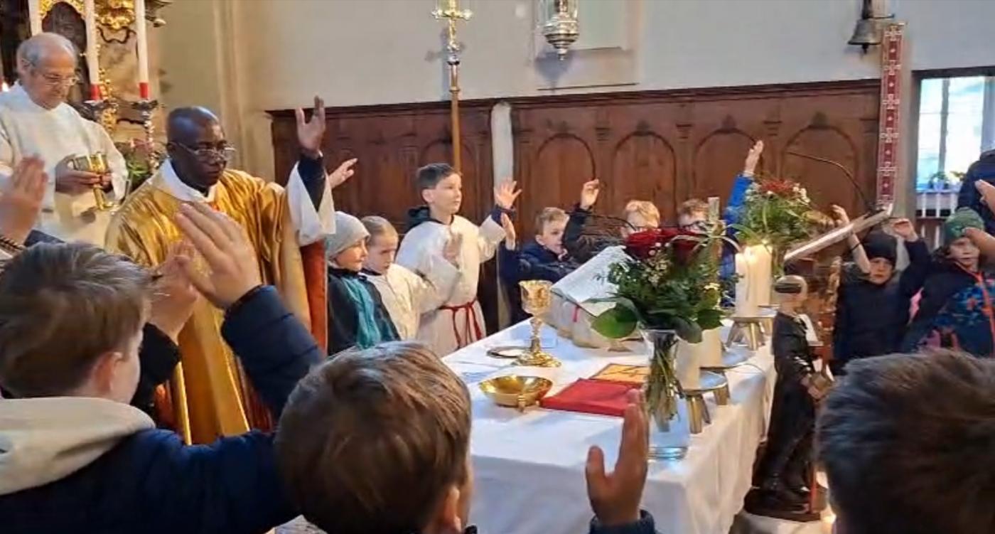 Das Vaterunser und den Friedensgruß feiern wir bei Pfarrer Vincent um den Altartisch.