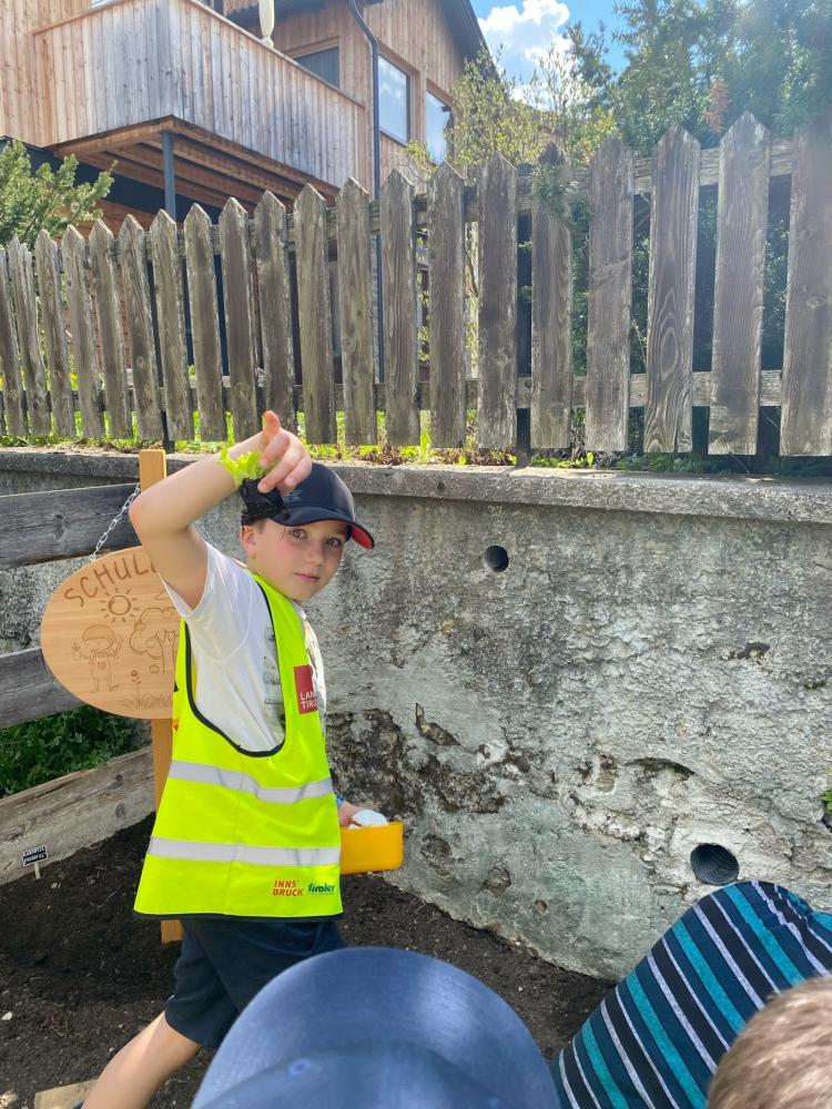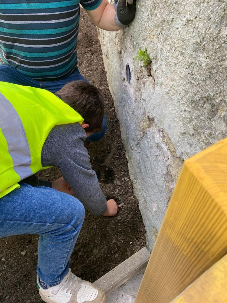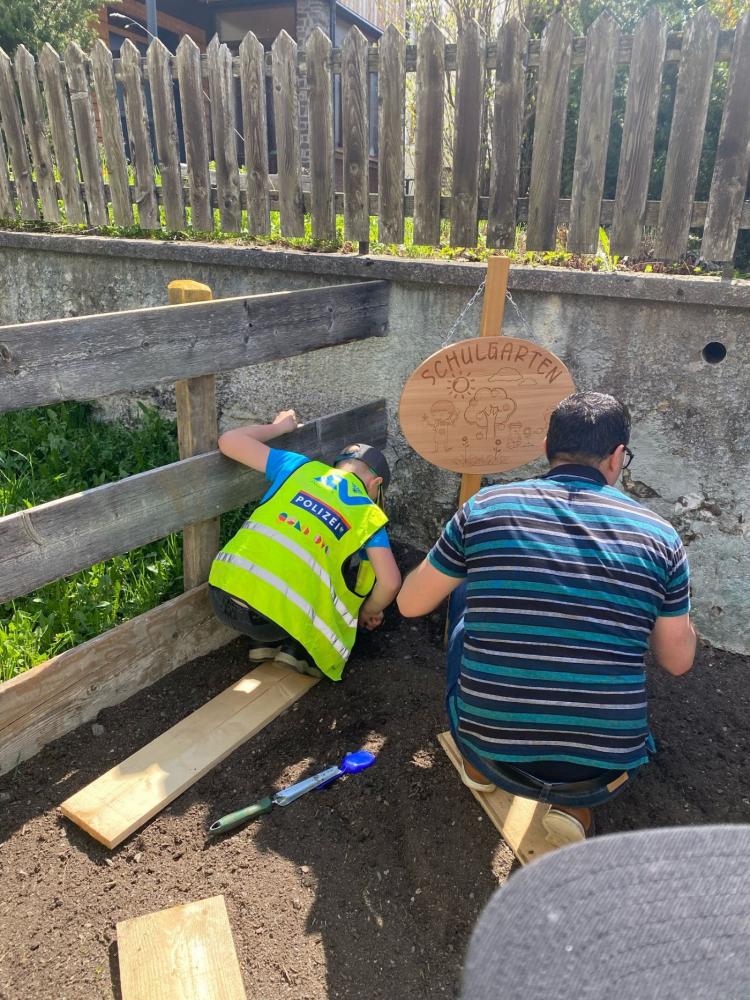 Mit Zustimmung einer finanziellen Unterstützung vom Bürgermeister ging das Planen und Umsetzen los. Einige Stunden wurden investiert: Umgraben, Platten legen, Ausfugen, Zaun errichten, Erde gattern,... und ein passendes Hinweisschild wurde angefertigt.