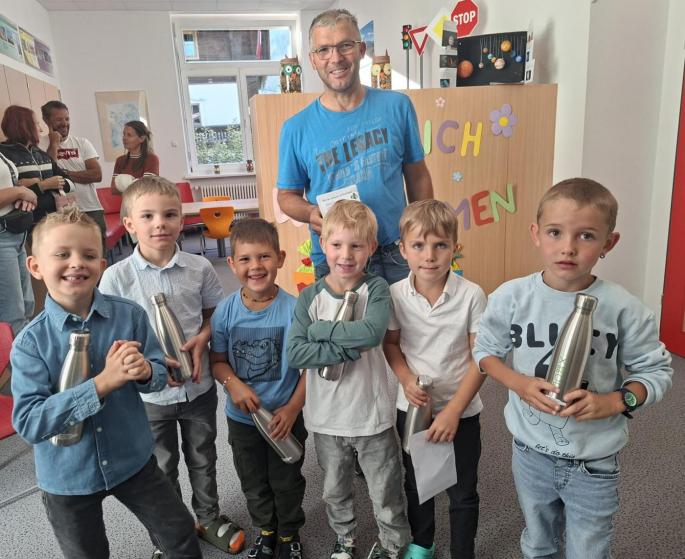 Der alljährliche Besuch am 1. Schultag von unserm Herrn Bürgermeister Josef Außerlechner, der die Ersteler mit tollen Jausenflaschen beschenkt, wird ebenfalls festgehalten.